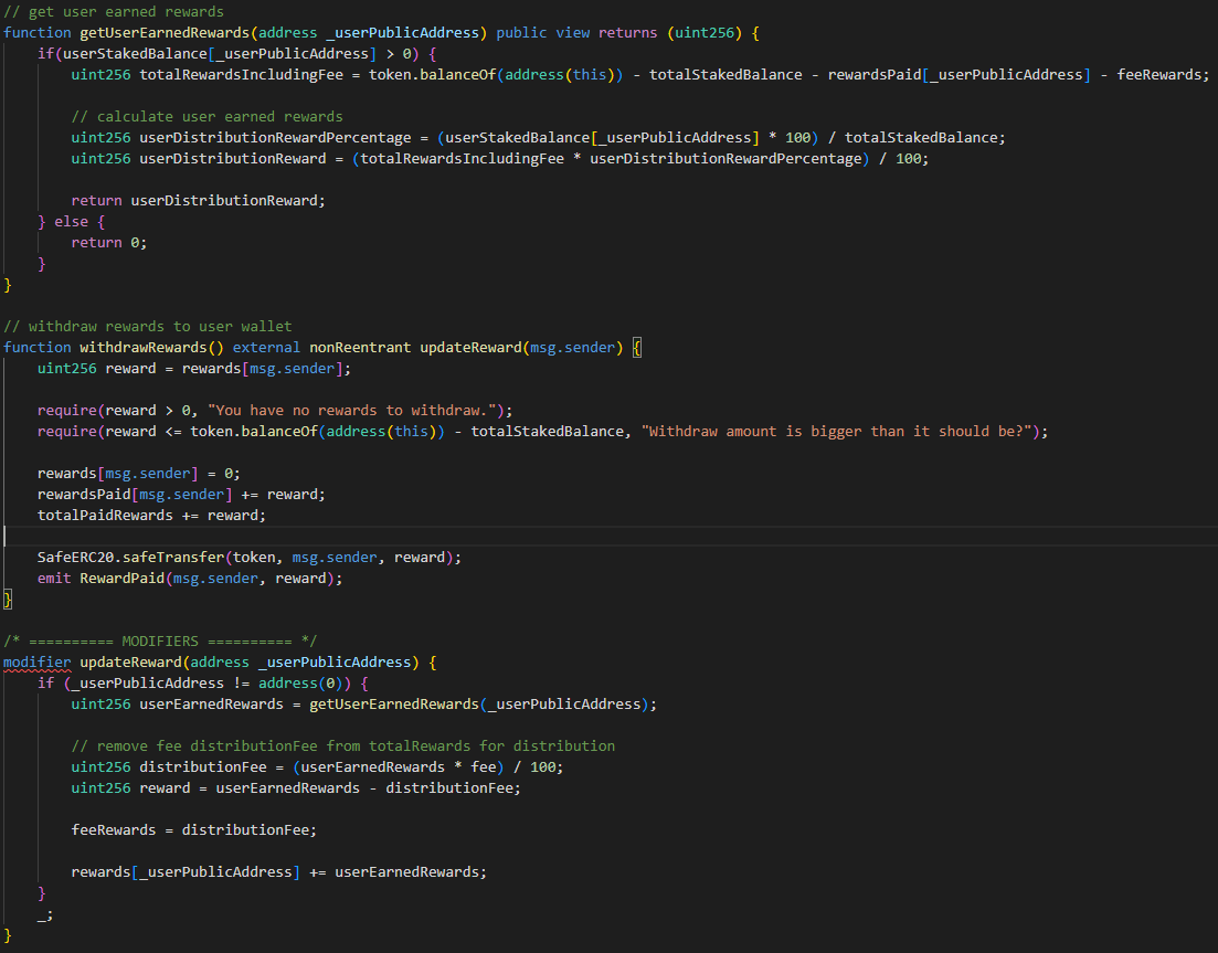 Everything works kinda perfect except now I have different problem - this is probably more mathematical question than solidity, but I will ask anyway. For example reward is 9. In smart contract I calculate rewardPerToken = 0 + (9 / 42) = 0.214285714285714285. Then I calculate based on that how much of reward each staker gets based on how much they are staking. For example first user has 10 tokens, so he gets - 10 * 0.214285714285714285 = 2.14285714285714285. Ok, now second user holds 32 tokens, so he gets - 32 * 0.214285714285714285 = 6.85714285714285712. If I add those results together I get - 6.85714285714285712 + 2.14285714285714285 = 8.99999999999999997, but in reality it should be 9? So there is 0,00000000000000003 tokens “lost in space”. Any clue how to avoid that?