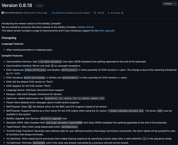 Solidity 0.8.18 was just released with the inclusion of some notable features, namely: